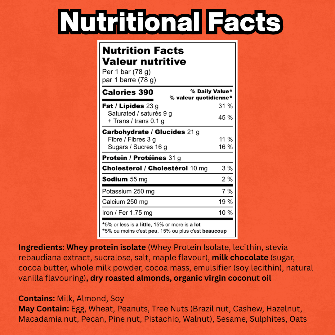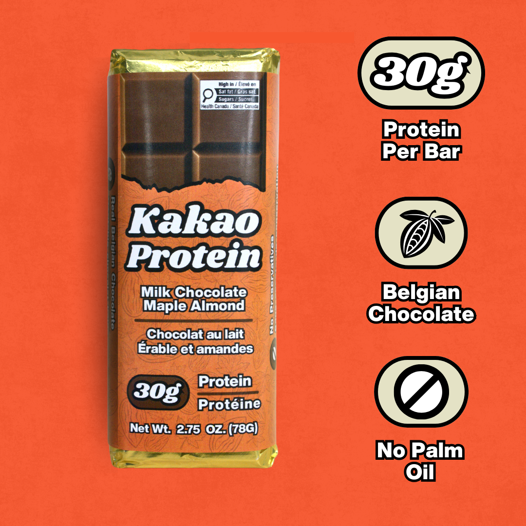 The Maple Almond Milk Chocolate Bar by Kakao Protein is handcrafted with premium Belgian milk chocolate and filled with a creamy, protein-packed almond butter core, subtly infused with maple flavour and a touch of organic virgin coconut oil for a velvety finish.